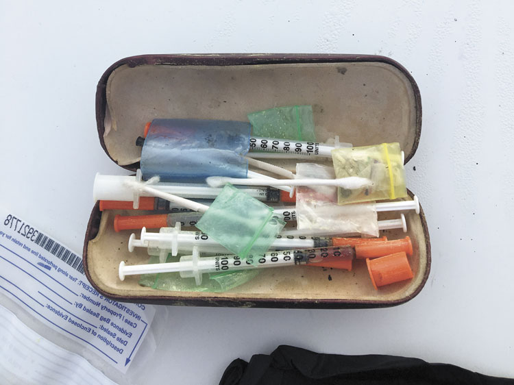 The case contained several syringes and small plastic bags containing drug filters. One of the syringes contained blood, Bergh said. There were no confirmed drugs in the bags, Bergh added.