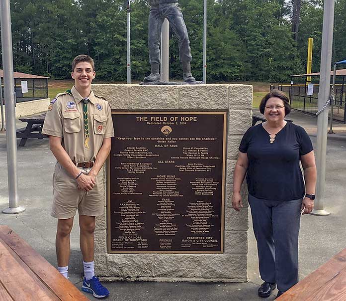 Jack Tucker of Boy Scouts of America Troop 201 in Fayetteville presented Ms. Quinn Bledsoe, Director of Peachtree City Recreation and Special Events, with two newly constructed picnic tables for the Field of Hope recently.