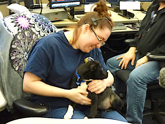 Dispatcher Ashleigh Sawyer was one of the dispatchers who helped the puppy start getting acclimated to its new surroundings, even holding the puppy on her lap at the console.