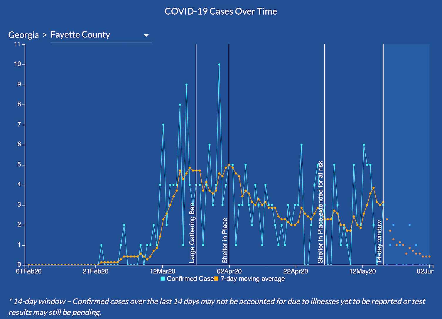 Fulton — 4,638, 242 deaths; Clayton — 1,238 cases, 51 deaths; Henry — 695, 23 deaths; Coweta — 422 cases, 9 deaths; Spalding — 277 cases, 22 deaths; Fayette — 237 cases, 13 deaths.