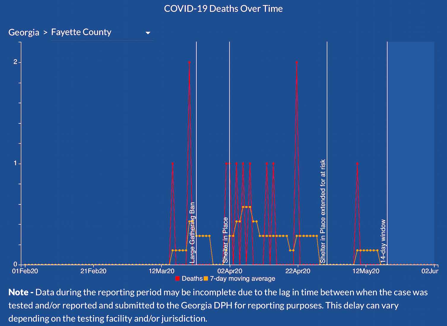 The graphs below represents a Fayette County report of cases over time in the first graph, and Fayette deaths over time just below that.