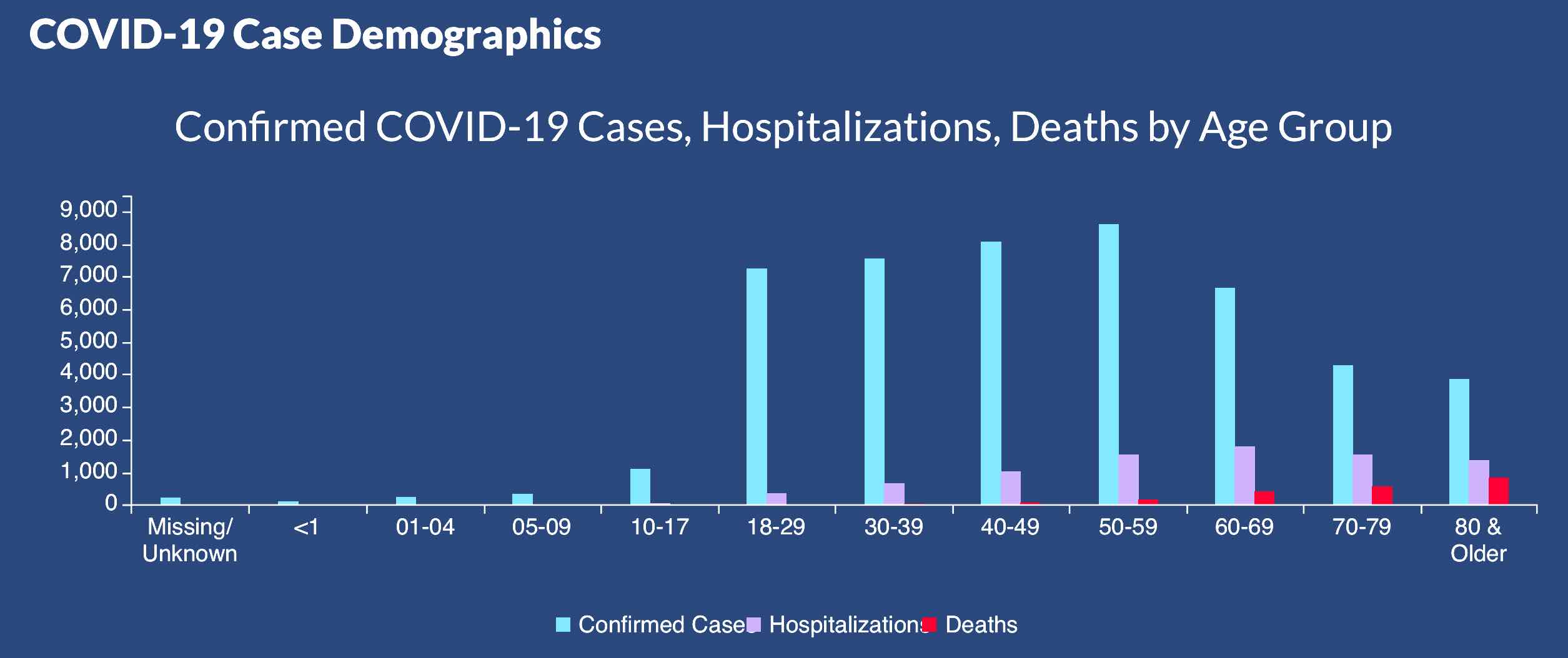 The chart below demonstrates statistics about who caught the coronavirus by age group, who was hospitalized by age group, and who died by age group.The fewest number of adults of any age group was those 80 and above, and they were the group with the most fatalities.