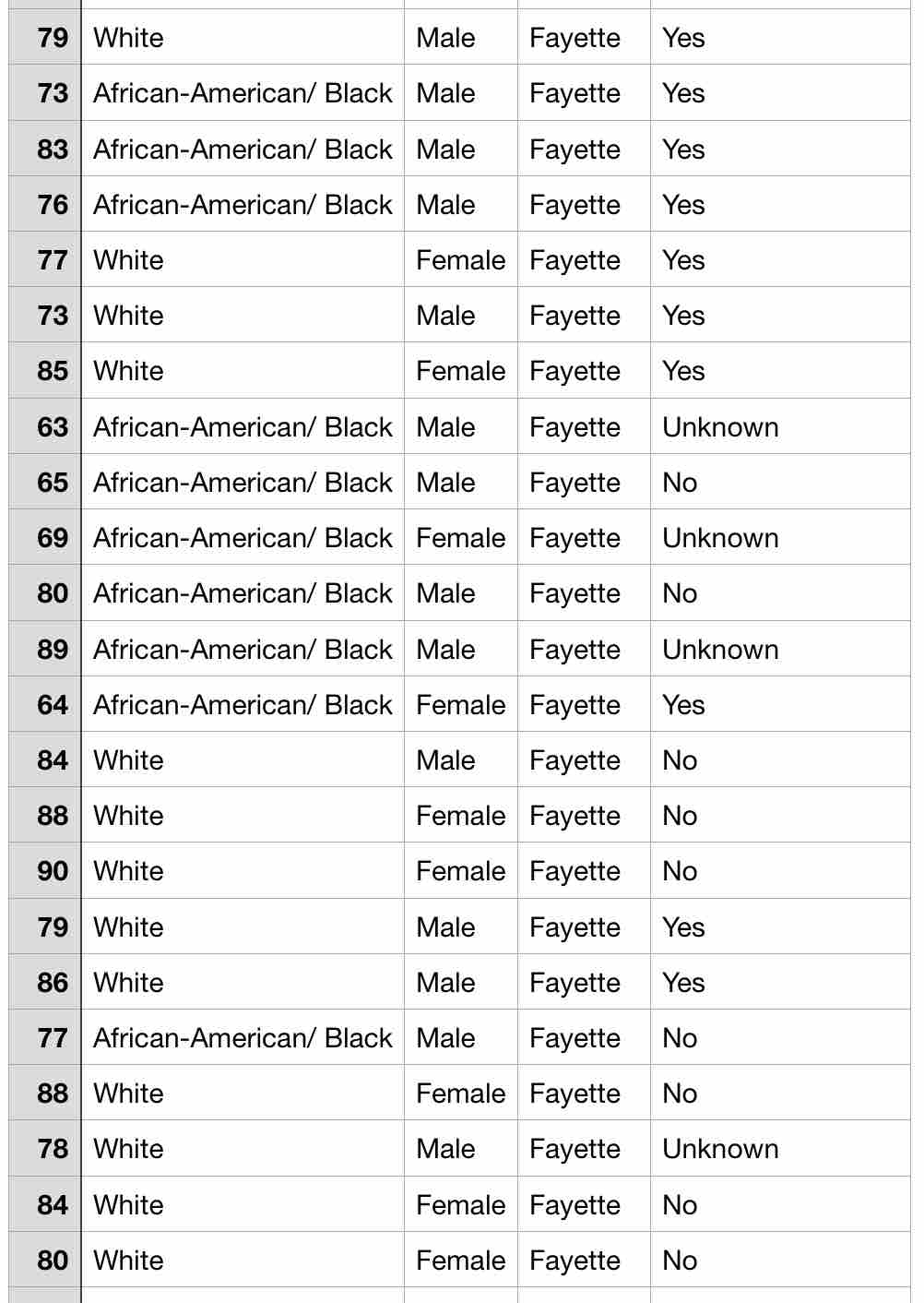 Here’s the breakdown: 8 black males, ranging from the youngest victim at 63 to the oldest male victim at 89; 6 white males, ranging from 73 to 86; 7 white females from 77 to 90; and 2 black females, ages 64 and 69.