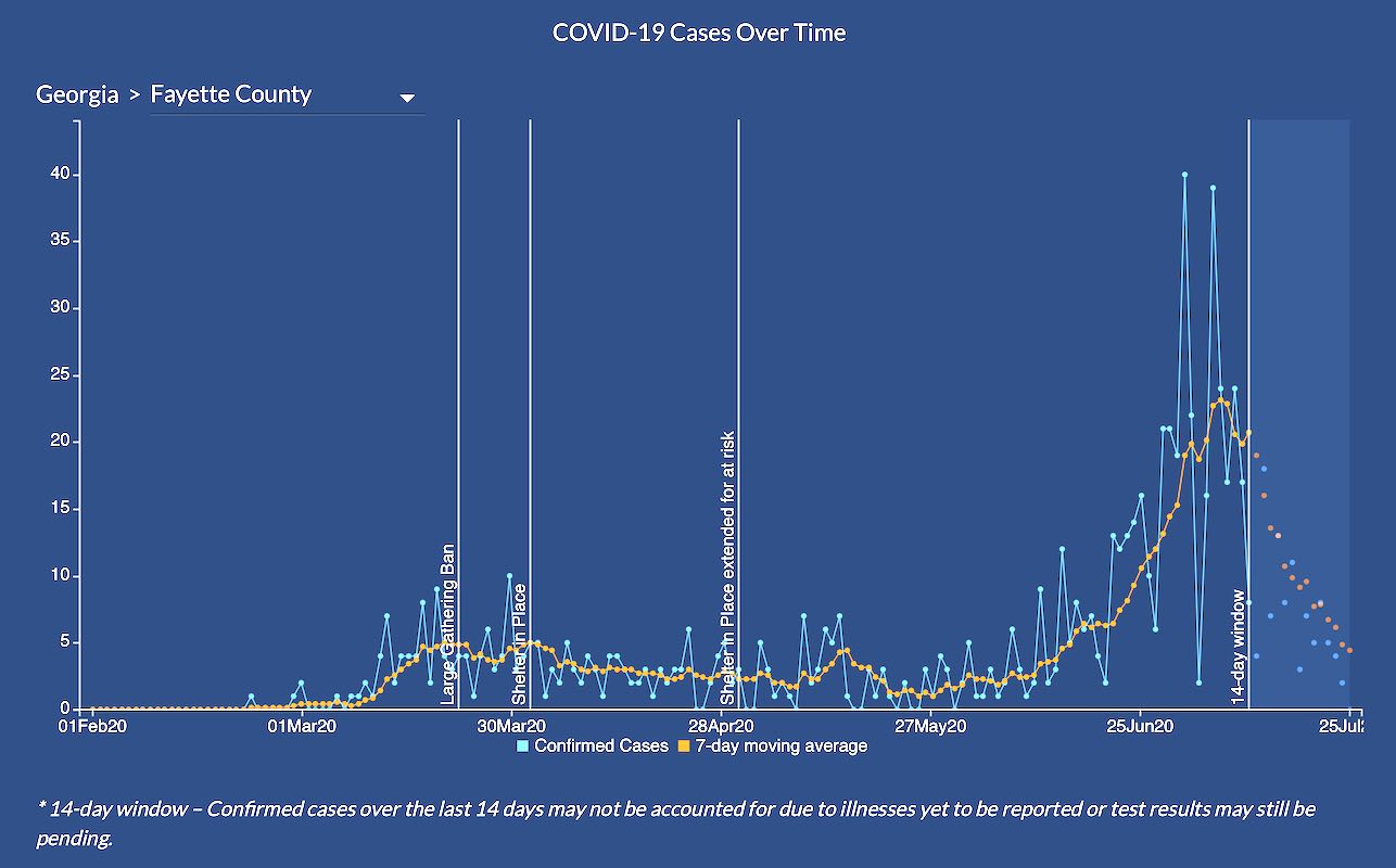 July 7 — 458 cumulative cases (+36 single largest daily increase so far for Fayette) with 19 deaths, 50 hospitalizations.