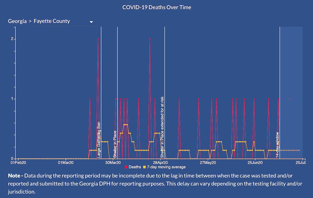 Below is a current DPH chart of reported Covid-19-related deaths that have occurred in Fayette County since the start of the pandemic. The chart is updated to reflect the latest data as of July 24 — 23 deaths attributed to the coronavirus. The newest fatalities are both white females, ages 80 and 90, both with no underlying medical conditions.