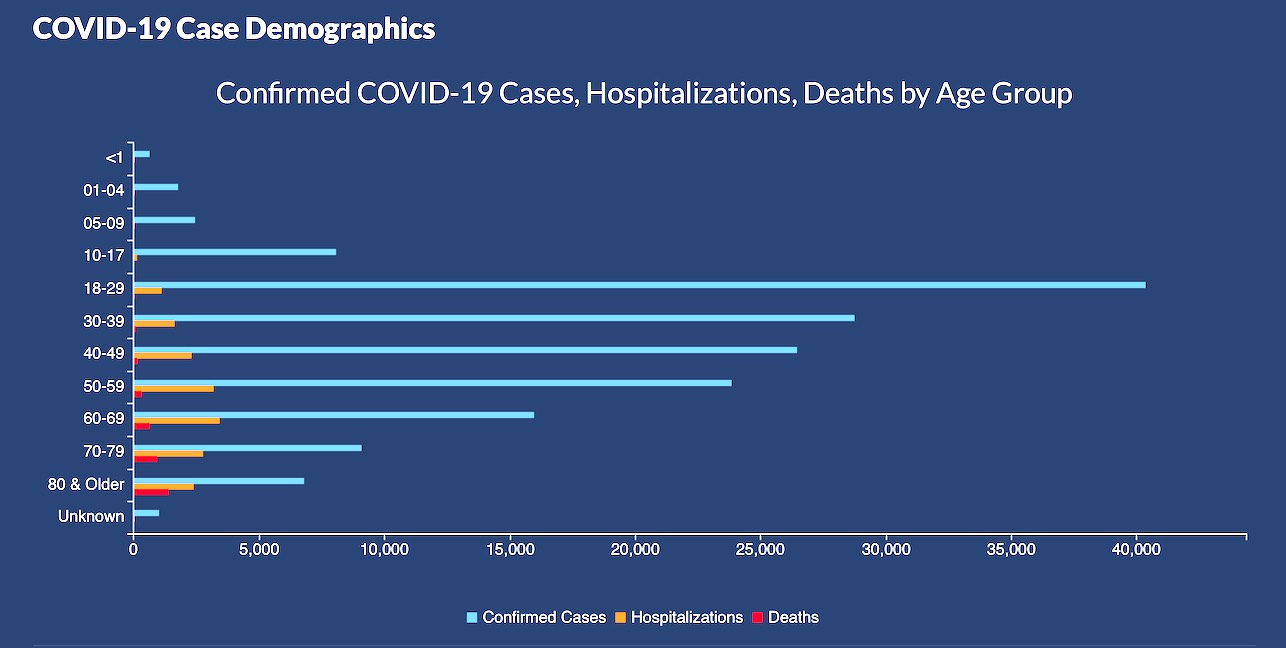 The chart below demonstrates statistics about who caught the coronavirus by age group, who was hospitalized by age group, and who died by age group.
