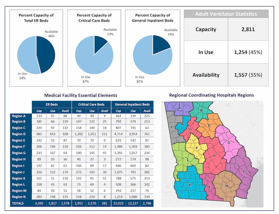 The July 24 situation report from the Georgia Emergency Management Agency shows that across the state, 3,135 persons are currently hospitalized and being treated for Covid-19, 22 fewer patients than the previous report; that 381 critical care beds (13%) remain available for incoming patients out of a total capacity of 2,951 critical care beds; and that 45% of the state’s available adult ventilators are in use. In other categories, 2,796 general inpatient beds (19%) are available out of a capacity of 15,023 general beds. Meantime, 46% of all emergency room beds in the state are available (1,578 out of a total capacity of 3,395 ER beds).