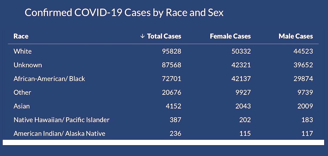 Cases by Race — White: 465 (+5). Black: 371 (+3). Asian: 16 (+1). Other: 2 (+0). Race Unknown: 770 (+2).