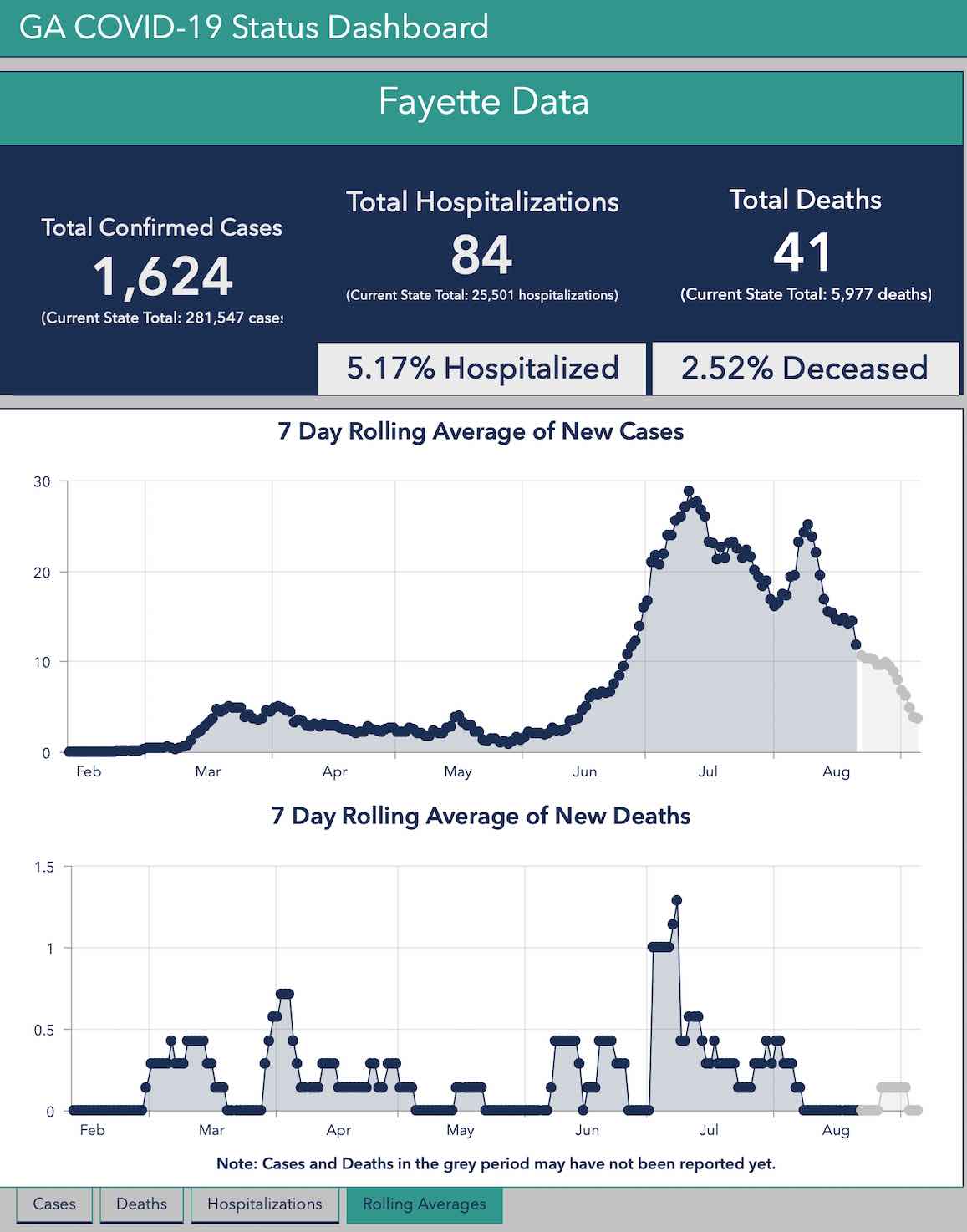 The chart and graphs below represents the most recent report of cases, hospitalizations and deaths in Fayette, taken from the Georgia Covid-19 Data Hub.