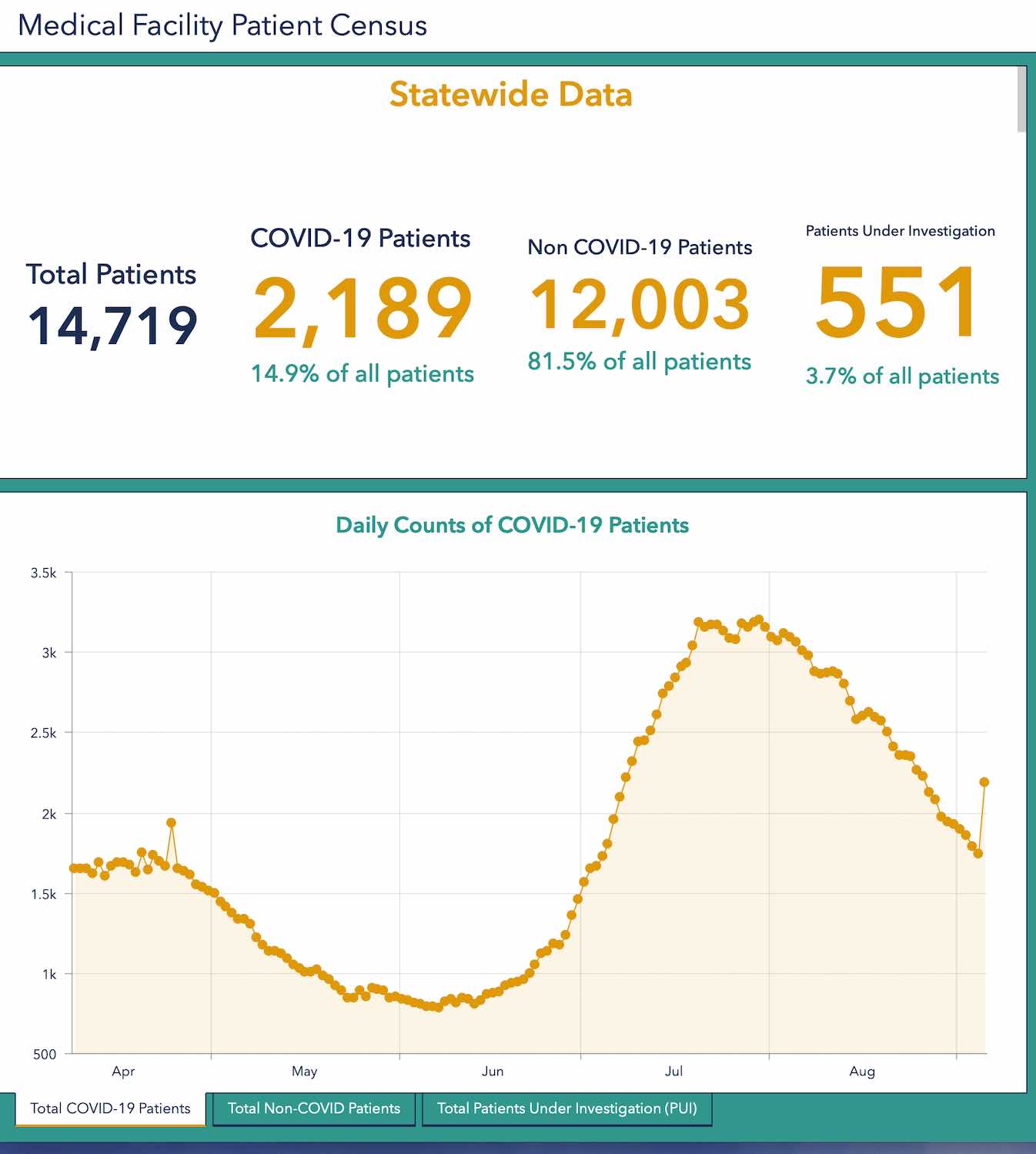 • Aug. 20 — 216 newly hospitalized patients; new statewide ICU admissions are 42.
