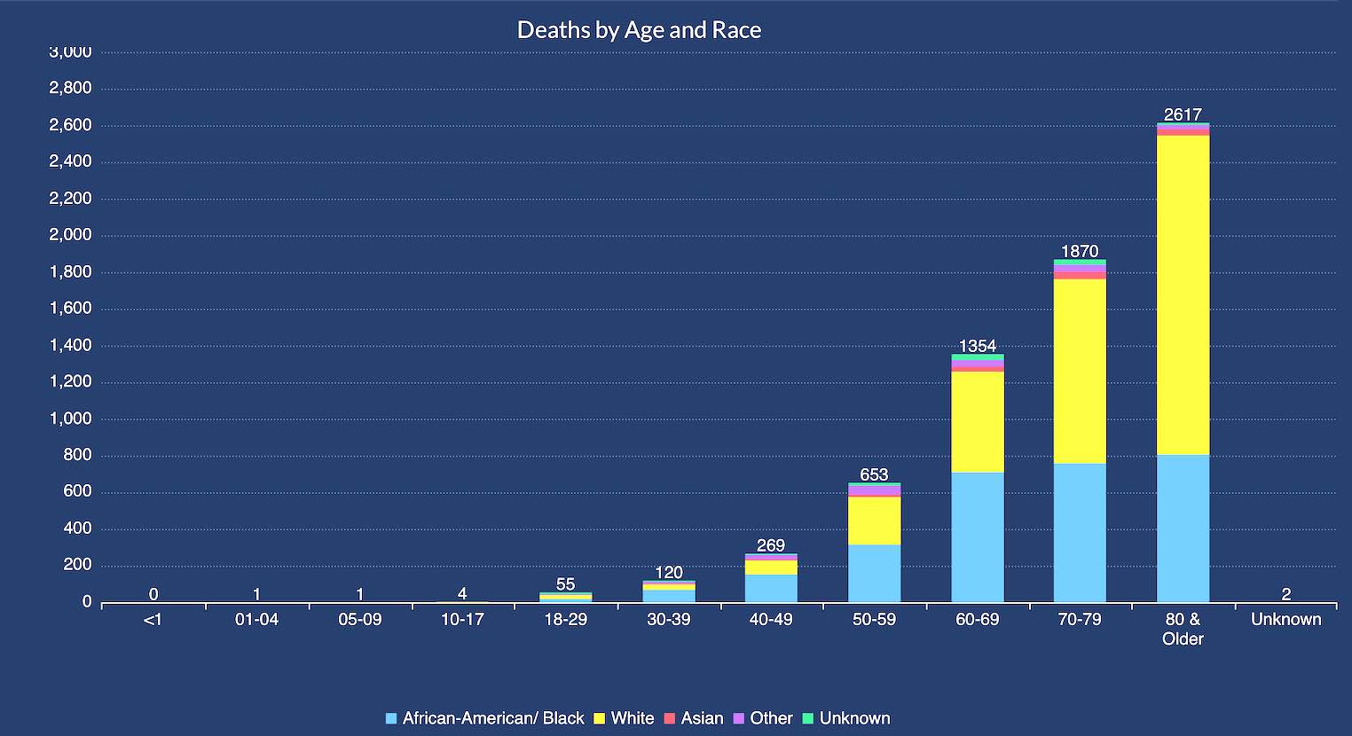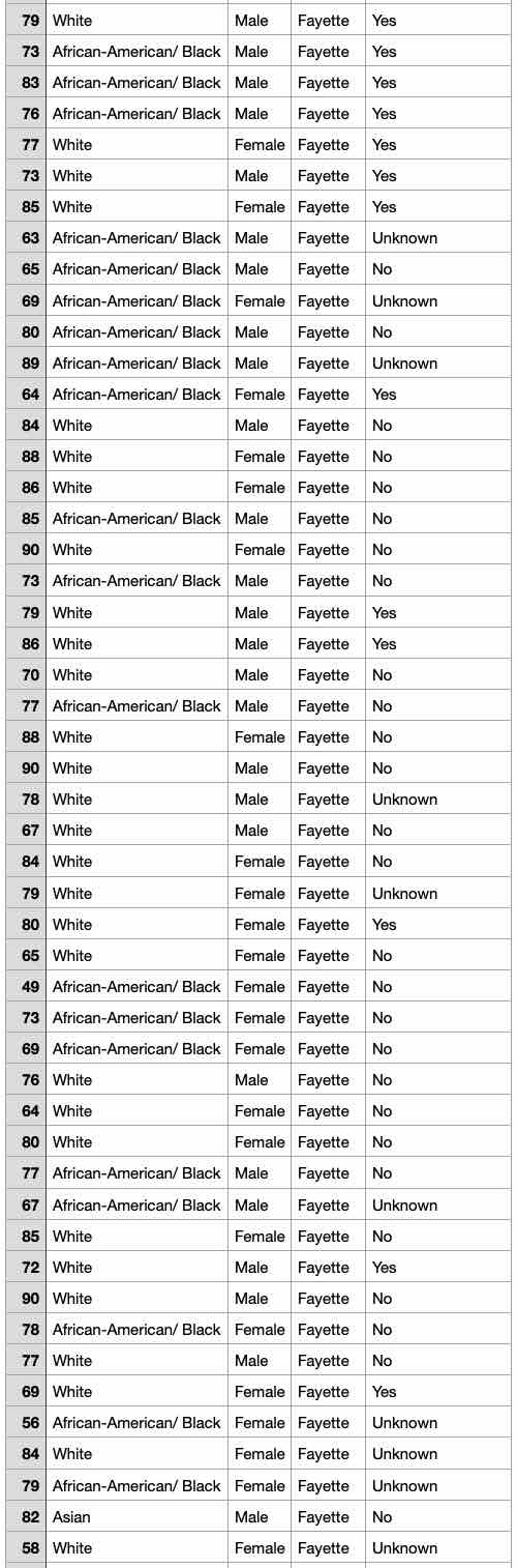 Here’s the breakdown of the 50 fatalities: 11 black males, ranging from age 63 to age 89; 13 white males, ranging from 67 to 90; 16 white females from 58 to 90; 8 black females, ranging in age from 49 to 78; an 82-year-old Asian male; and a 56-year-old female of unknown race. There are now 3 persons aged 90 — one white female and 2 white males — who are the oldest victims of Covid-19 in Fayette County. The youngest victim so far is a 49-year-old African-American woman with no known underlying medical conditions.