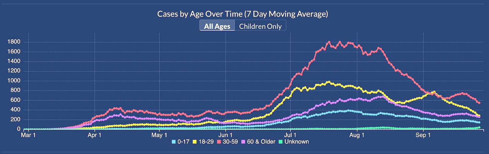 Sept. 27, 2020 Cases by Age — Age 0 to 4: 11 (+0). Age 5 to 14: 64 (+0). Age 15 to 24: 367 (+2). Age 25 to 34: 219 (+3). Age 35 to 44: 238 (+0). Age 45 to 54: 328 (+1). Age 55 to 64: 301 (+2). Age 65 to 74: 168 (+0). Age 75 to 84: 90 (+0). Age 85 Plus: 42 (+1). Age Unknown: 22 (+1). TOTAL: 1,850 (+10).