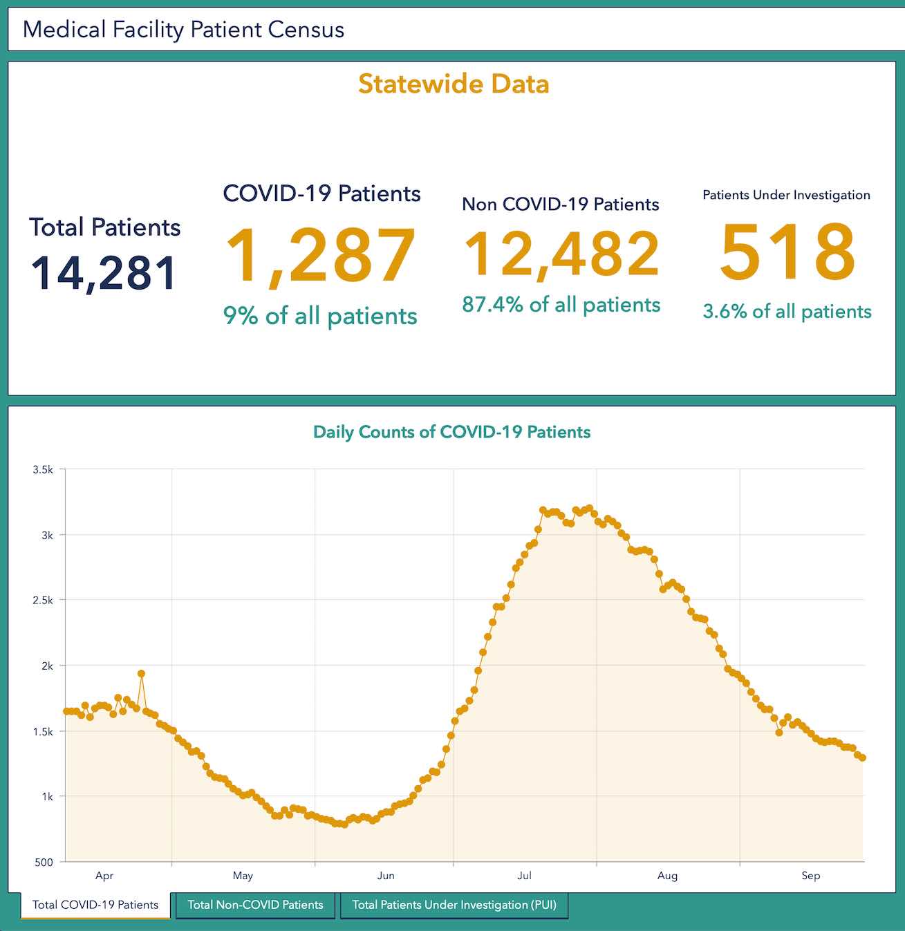 • Sept. 7 — (Labor Day report) 15 newly hospitalized patients; new statewide ICU admissions are 3.