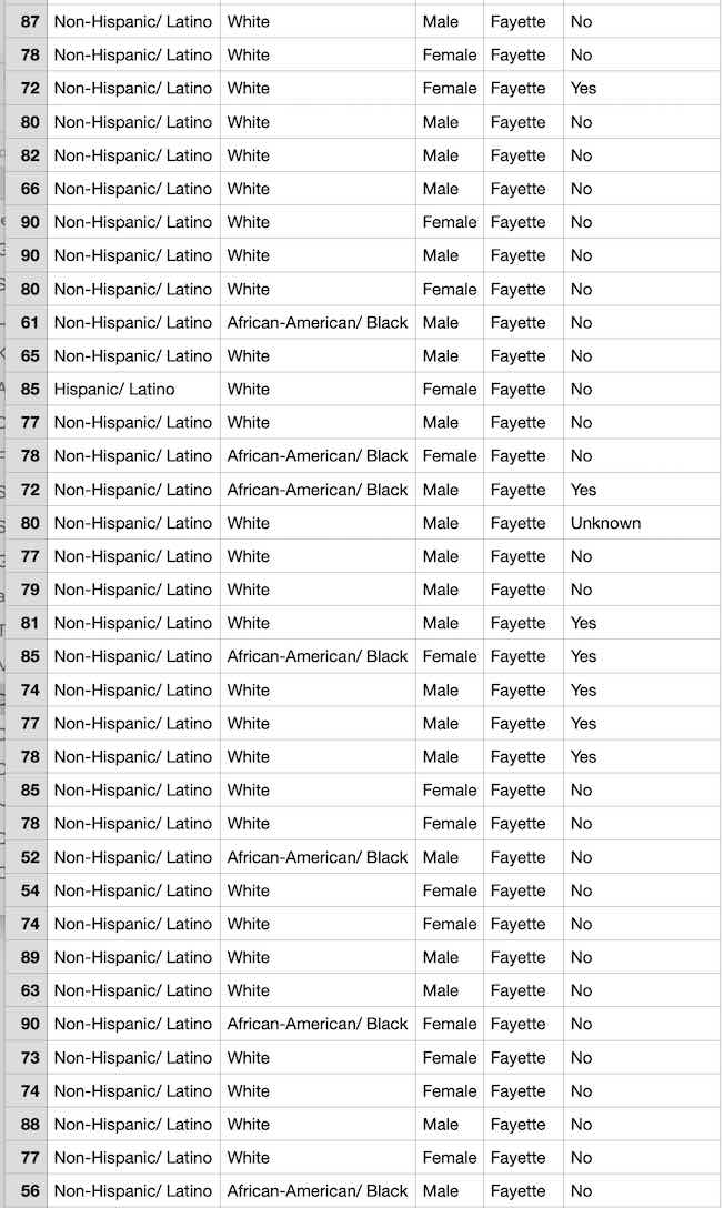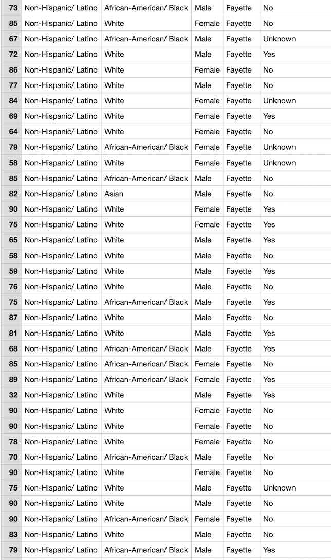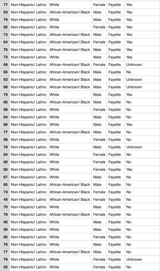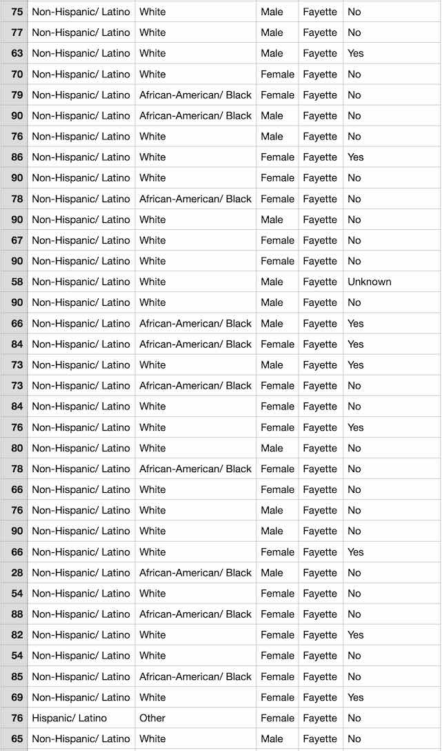 On April 14, DPH reported 3 Fayette fatalities:Ā a 90-year-old white male and a 63-year-old white female, both with no other medical conditions; and a 40-year-old Hispanic white male with an underlying medical condition.