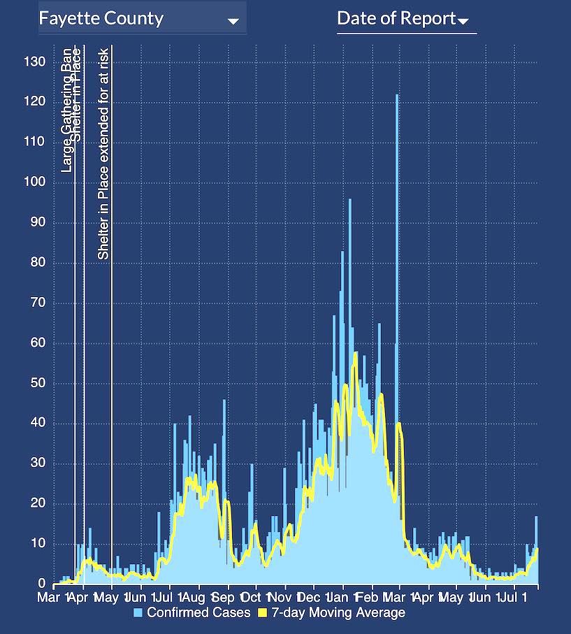 Even with an uptick in case numbers Fayette still has a 2-week rate of positive Covid tests of 1.3%, still very low. By comparison, neighboring Coweta has a 2-week infection rate of 9.2% and the entire state’s rate has risen from 3.0% to 8.3%.
