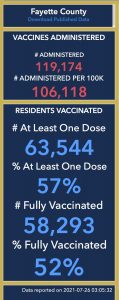 Fayette now has one of the highest vaccination rates in the state: 52% fully vaccinated and 57% with at least 1 shot.