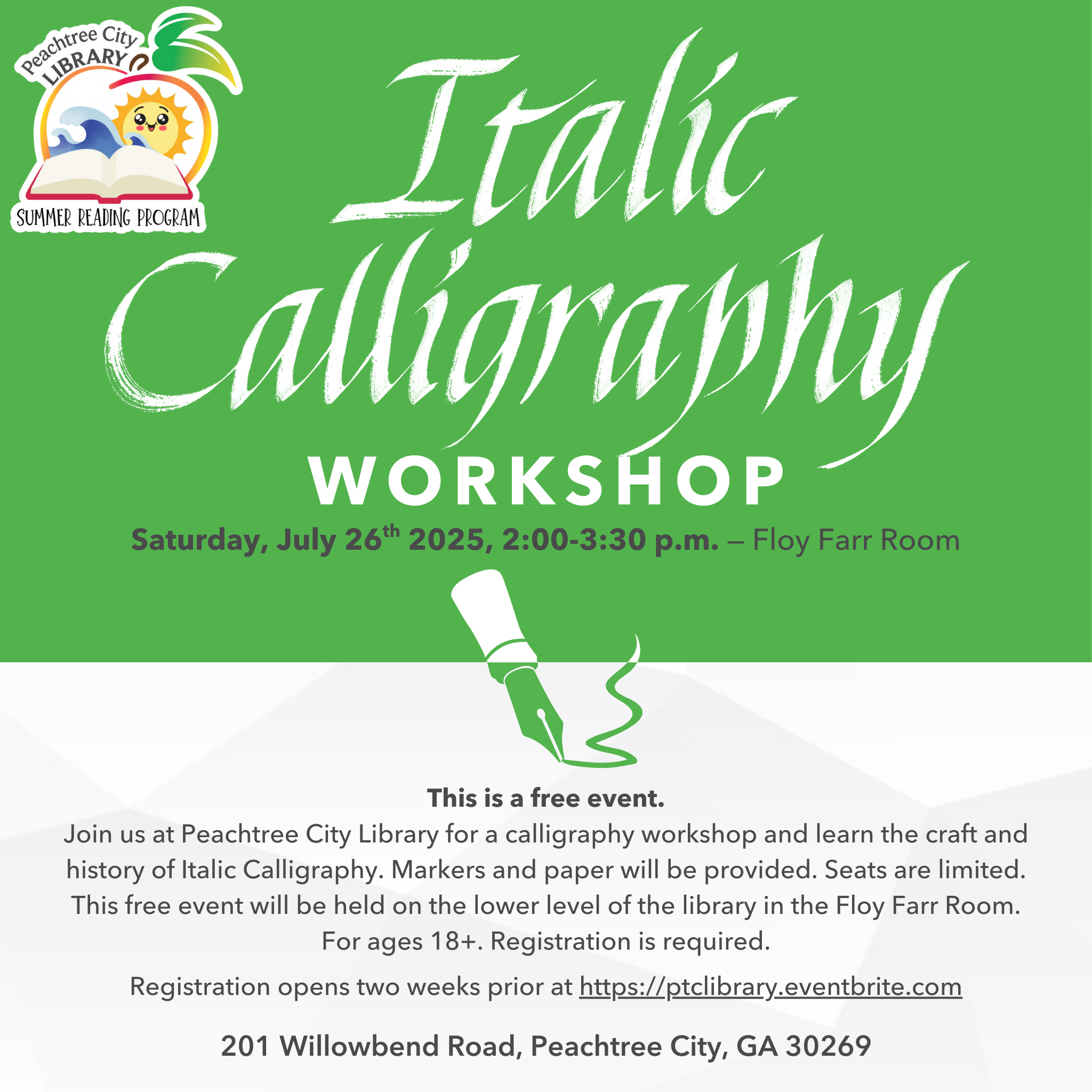 Join us at Peachtree City Library for a calligraphy workshop and learn the craft and history of Italic Calligraphy. Markers and paper will be provided. Seats are limited. This free event will be held on the lower level in the Floy Farr Room.