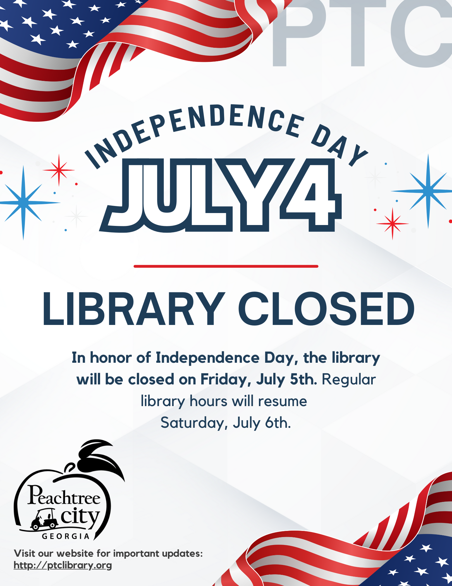 Peachtree City Library Closed for Independence Day Regular library hours will resume Saturday, July 5th